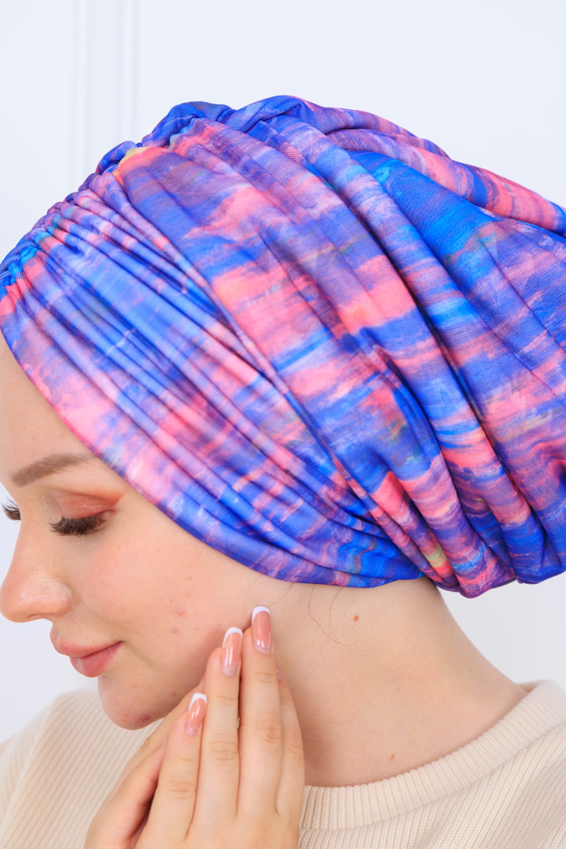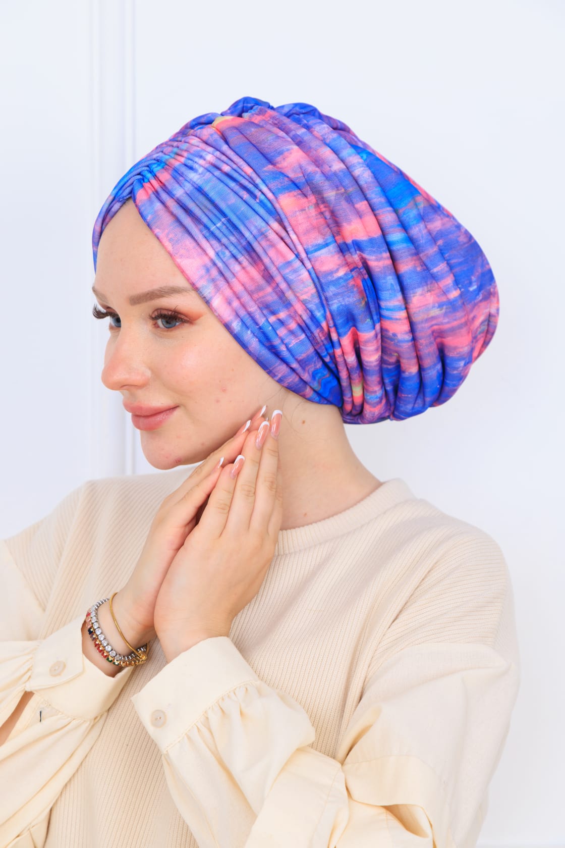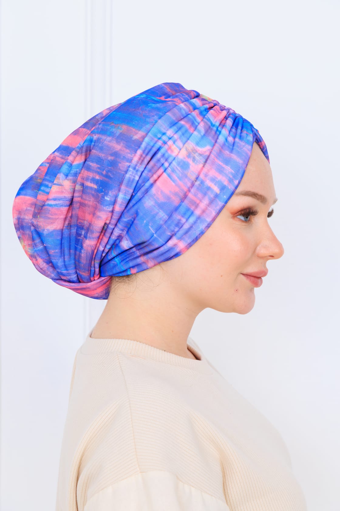 Drapeli yapısı sayesinde, başınıza kolayca uyum sağlar ve kullanırken rahatsızlık hissi vermez. Şıklığını artıran dolgulu detayları ise hem görünüşüne hem de konforuna katkıda bulunur. Farklı renk ve desen seçenekleriyle, her zevke hitap edecek şekilde tasarlanmıştır.