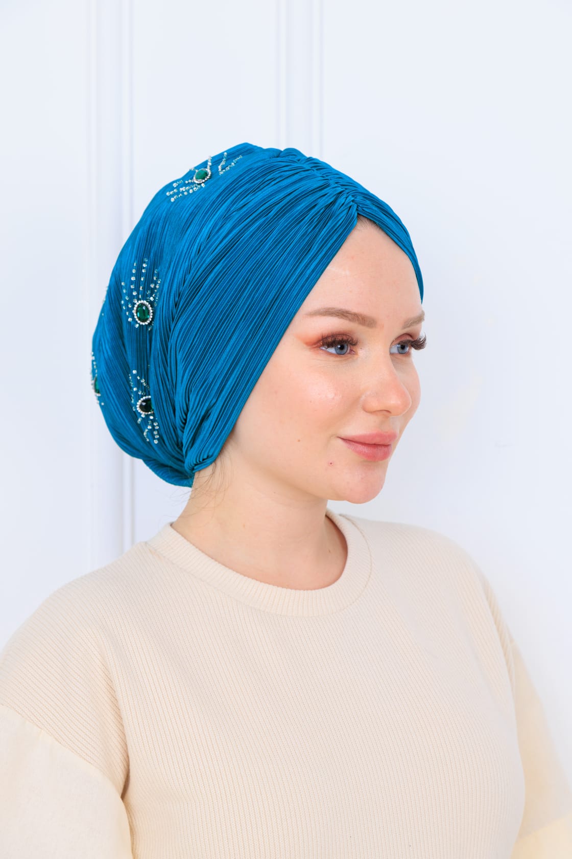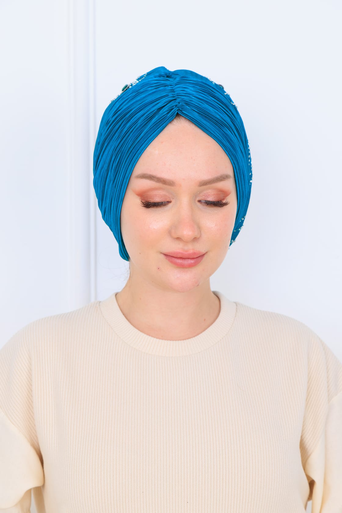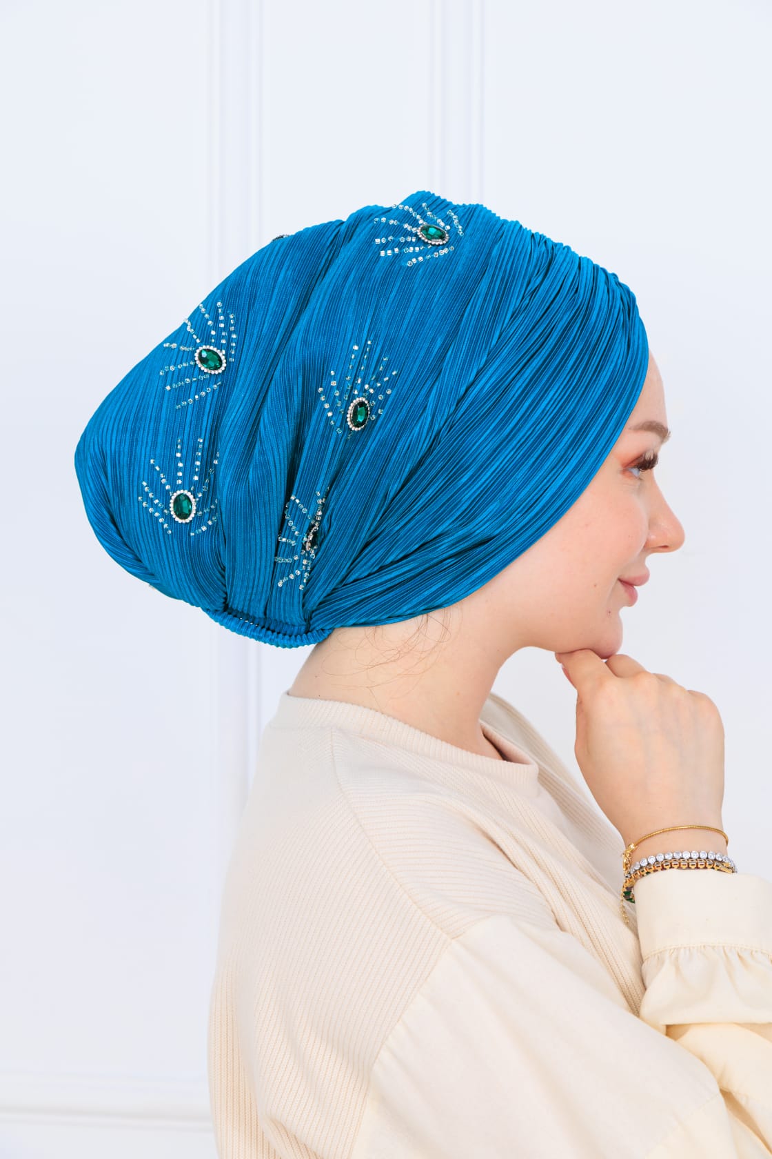 Drapeli dolgulu piliseli el işlemeli bone, şıklığı ve zarafeti bir araya getiren özel bir baş giyisidir. Modern tasarım detaylarıyla bezeli bu bone, aynı zamanda el işçiliği ile de kendine has bir tarz sunmaktadır. Yüksek kaliteli malzemelerden üretilen bu ürün, günlük kullanımda ya da özel davetlerde şıklığını korumak isteyen kadınlar için ideal bir tercihtir.
