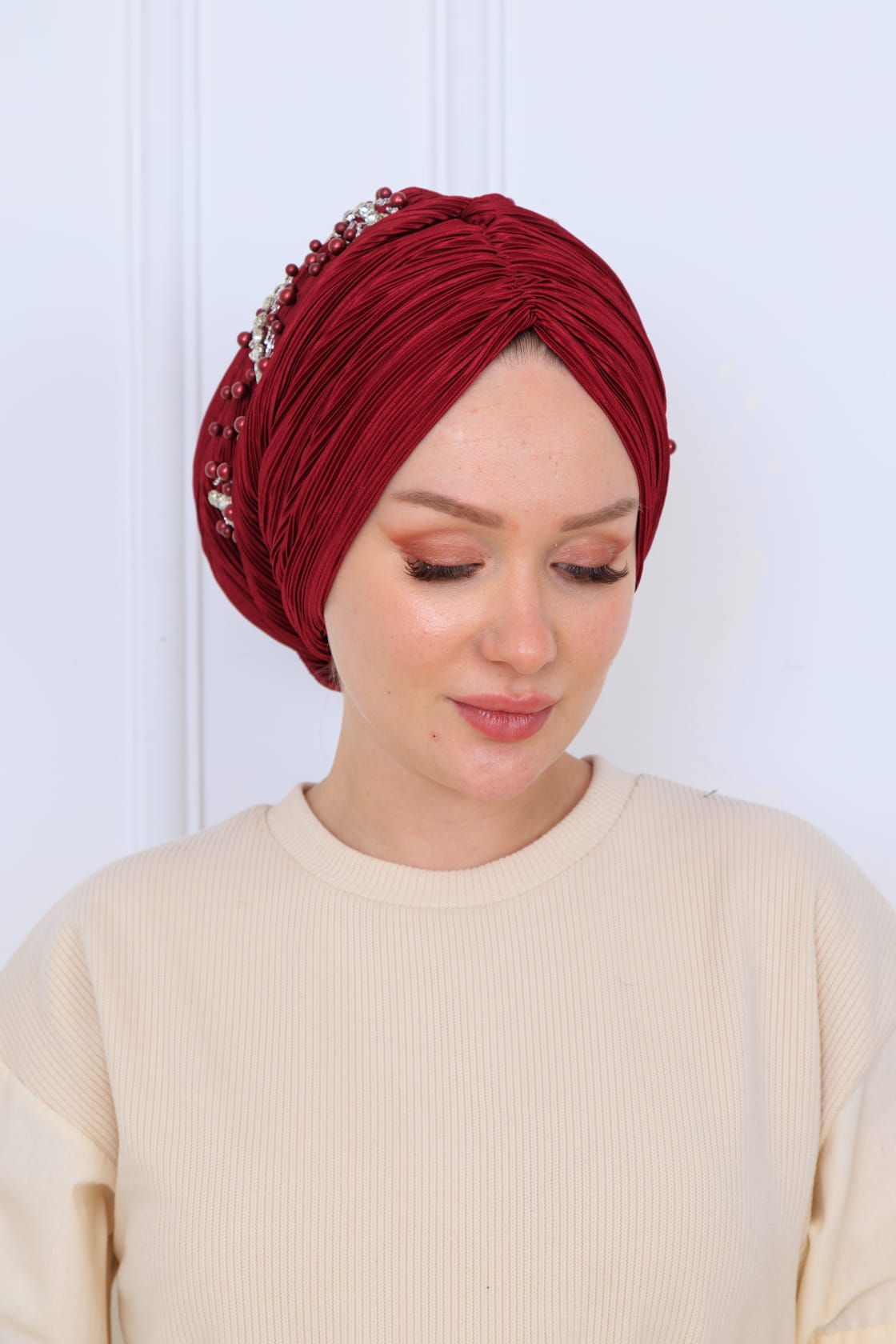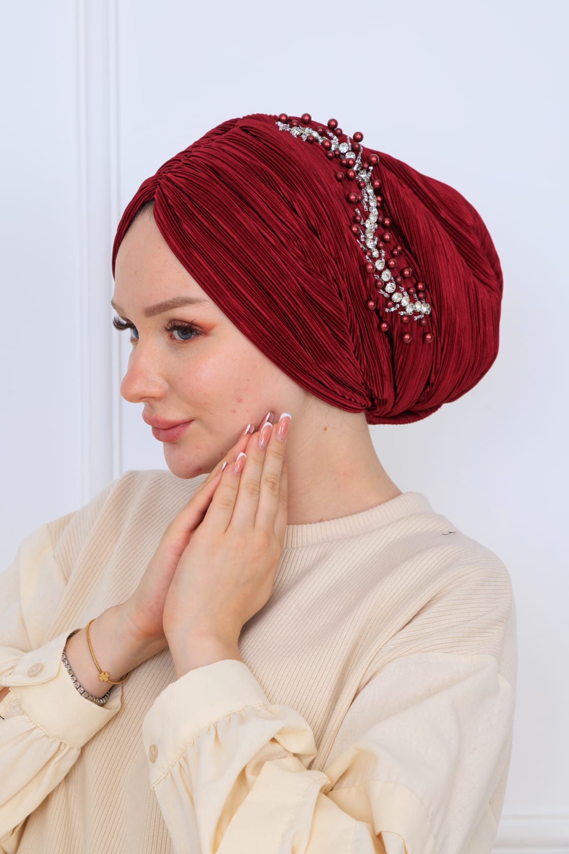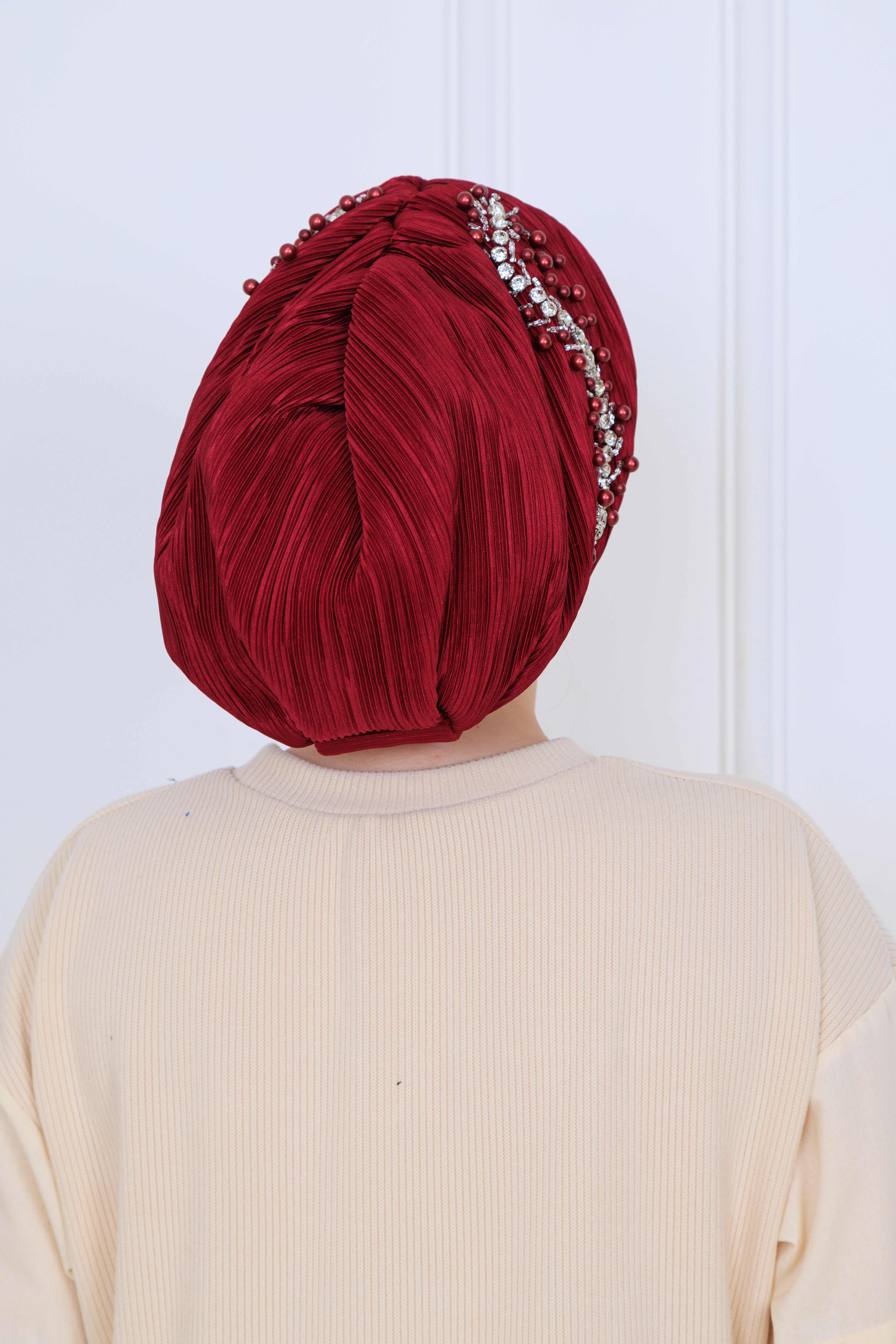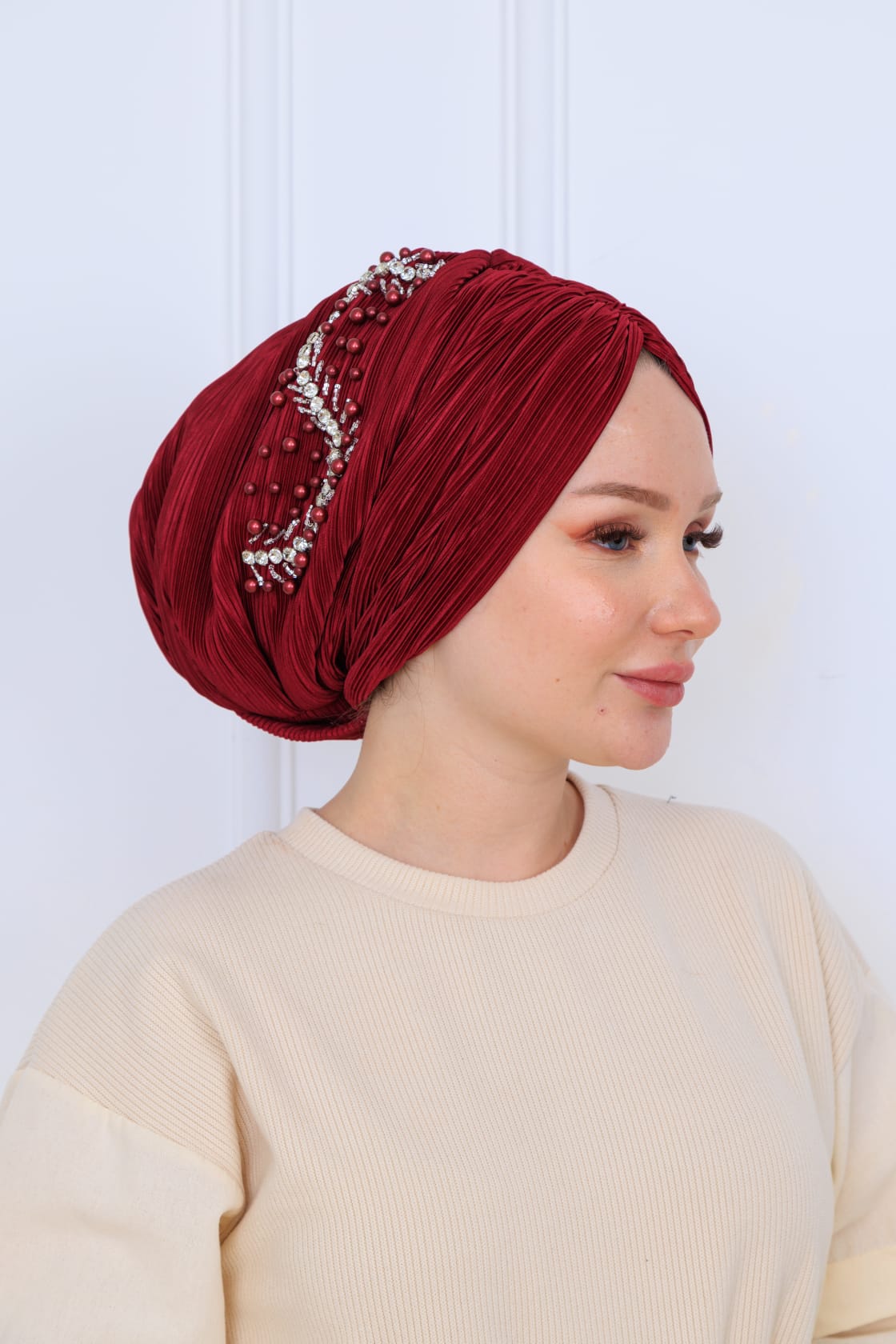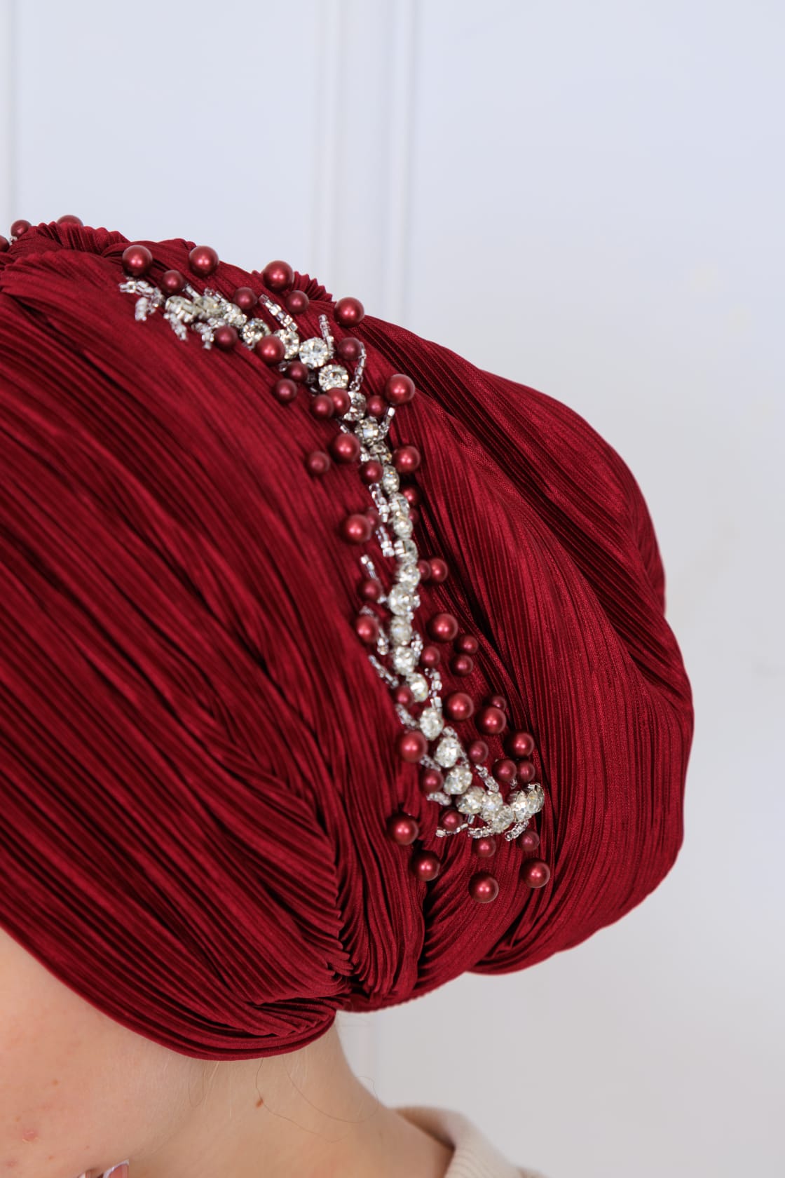 Drapeli dolgulu piliseli işlemeli bone, şıklığı ve rahatlığı bir arada sunan özel bir tasarıma sahiptir. Modern moda anlayışını yansıtan bu bone, günlük kullanımdan özel günlere kadar her durumda ideal bir aksesuar olarak öne çıkmaktadır.