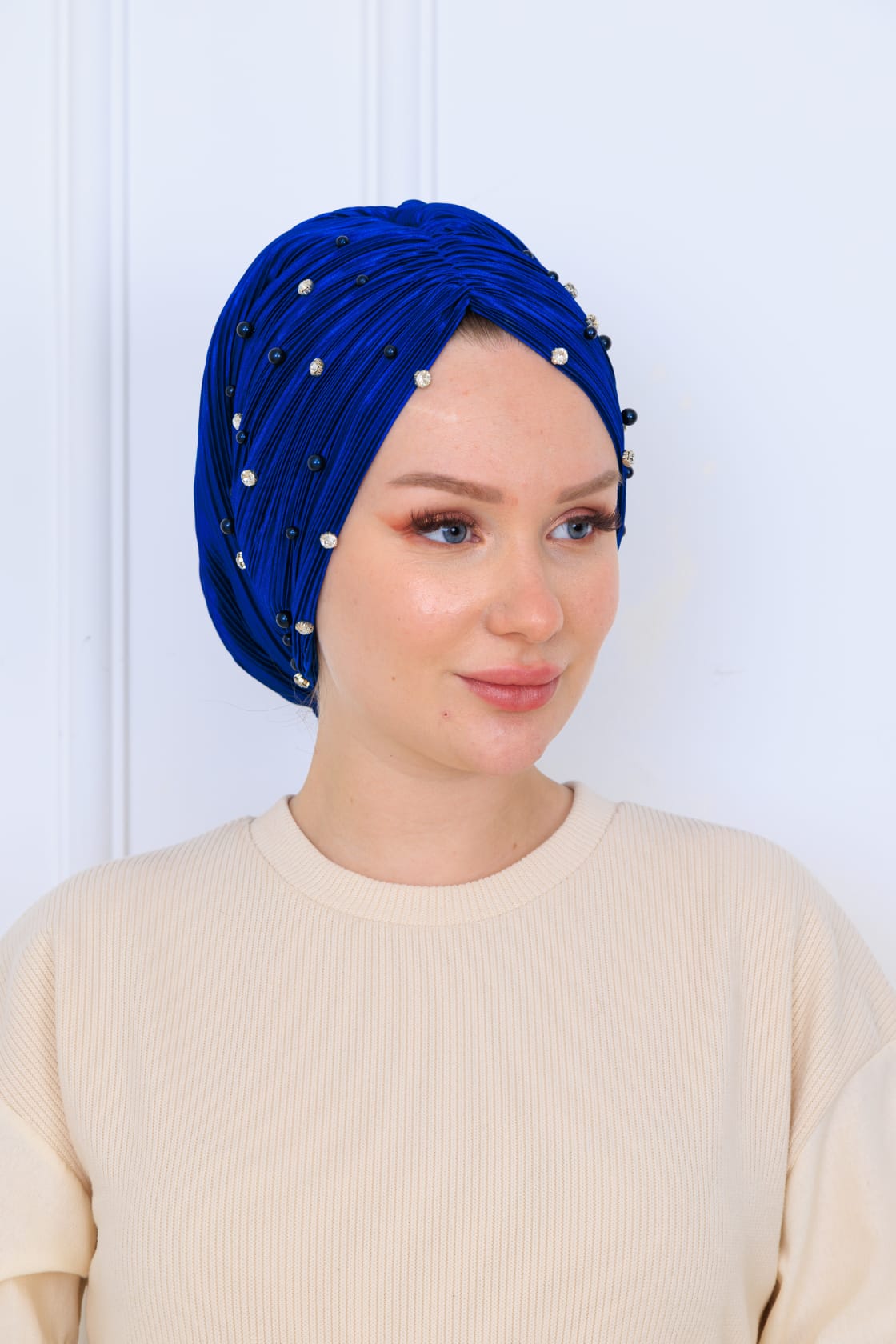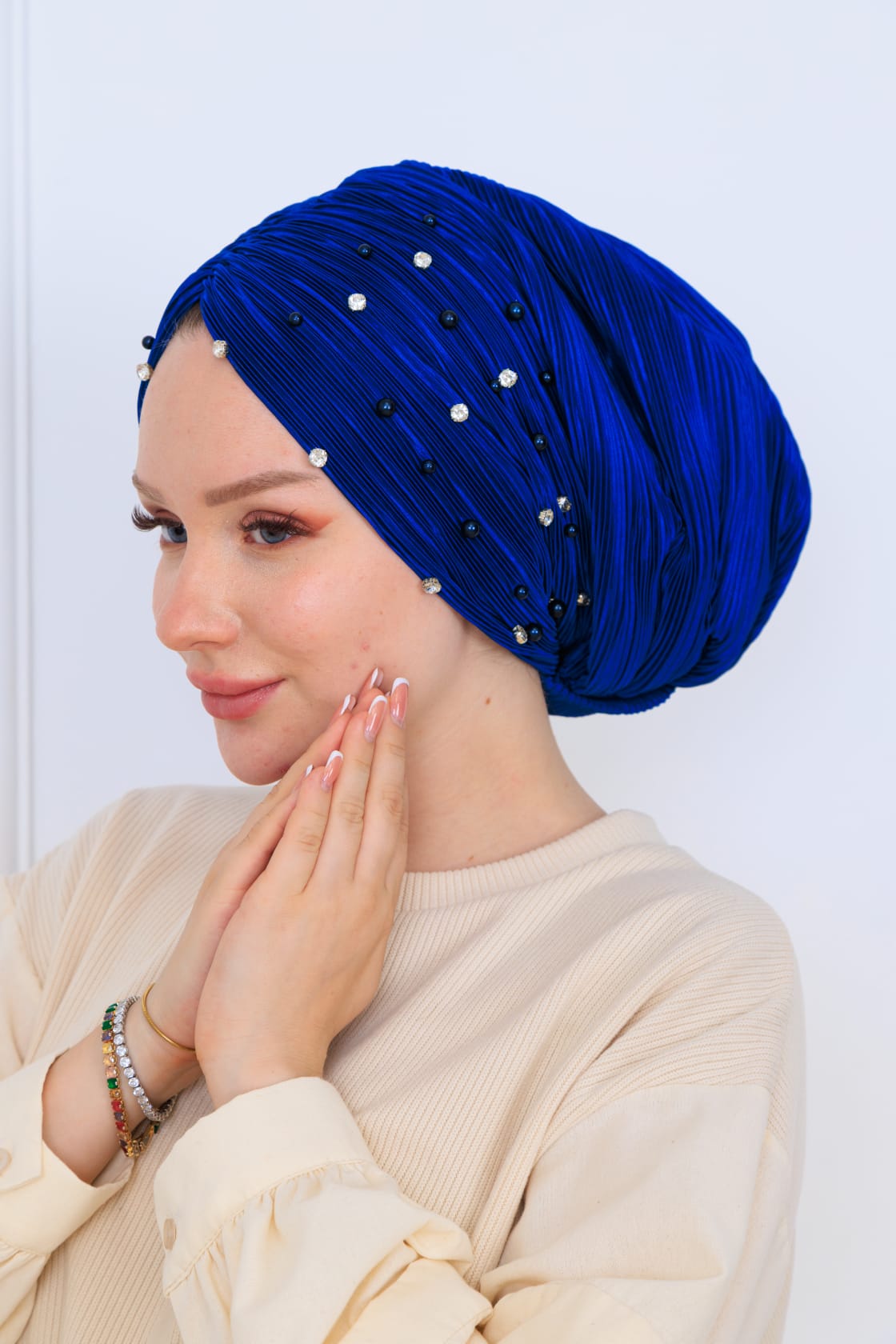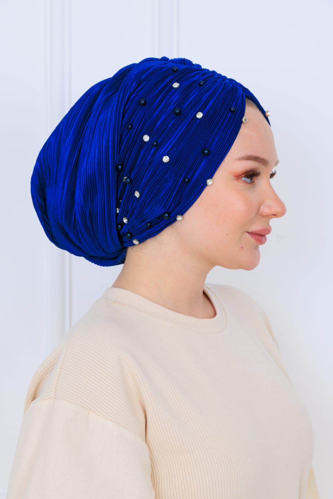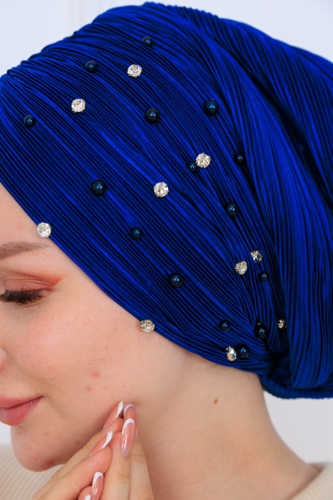 Şıklığı ve zarafeti bir araya getiren drapeli dolgulu piliseli ön işlemeli bone, modern tasarımı ile her alanda kullanıma uygundur. Hem günlük hem de özel davetlerde tercih edebileceğiniz bu bone, kullanıcılarının konforunu ön planda tutarak tasarlanmıştır.
